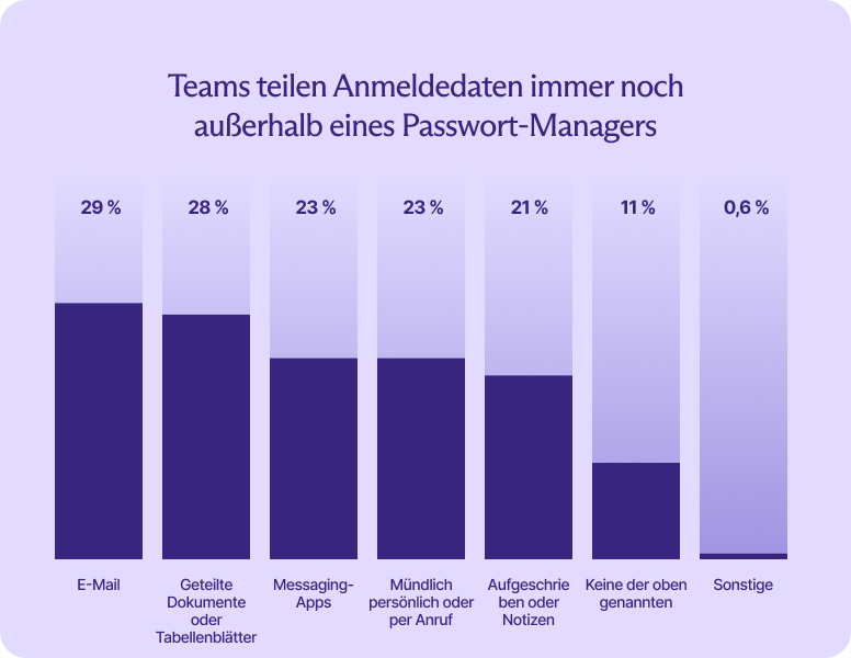 Das Teilen von Passwörtern ist ein klares Beispiel. Selbst Befragte, die einen Passwort-Manager in ihrem Tech-Stack haben, teilen Anmeldedaten immer noch per E-Mail, in Messaging-Apps, freigegebenen Dokumenten, Unterhaltungen oder schriftlich.