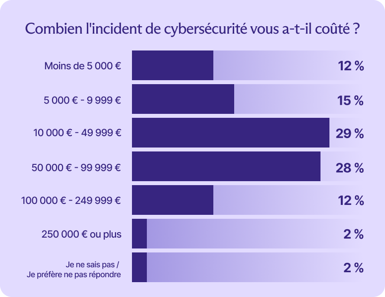 Les petites entreprises qui ont signalé des fuites de données l'année dernière investissaient dans leur sécurité, mais leurs défenses ont échoué. Les attaques ont fini par leur coûter environ autant d'argent qu'elles en avaient dépensé pour la protection. Environ 57 % ont signalé des pertes comprises entre 10 000 $ et 100 000 $.