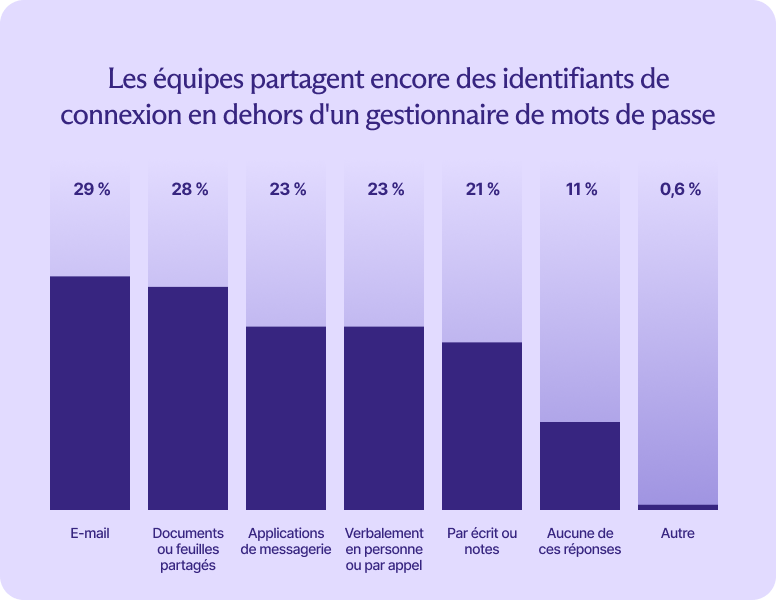 Le partage de mots de passe en est un exemple clair. Même les répondants qui disposent d'un gestionnaire de mots de passe dans leur pile technologique partagent toujours des identifiants par message, applications de messagerie, documents partagés, conversations ou par écrit.