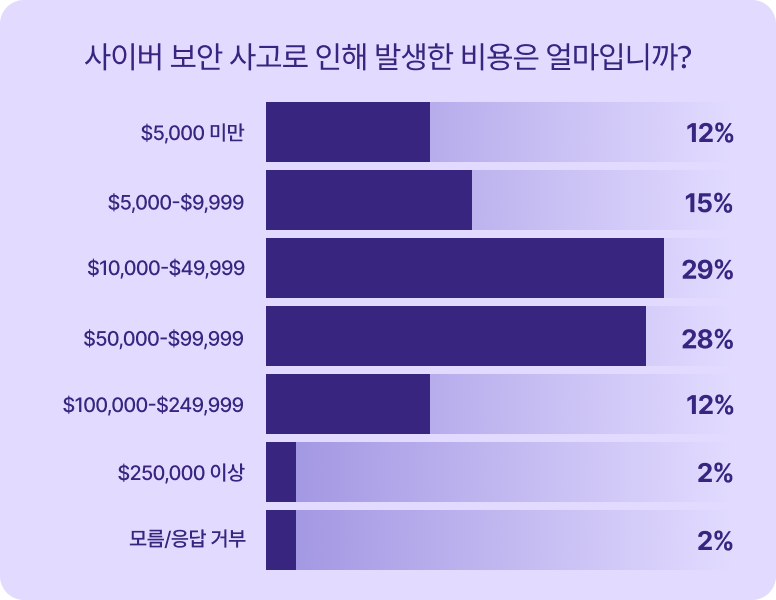 작년에 보안 사고를 보고한 소규모 기업들은 보안에 비용을 지출하고 있었지만, 방어에 실패했습니다. 공격으로 인해 보호에 지출한 비용만큼이나 많은 비용이 소요되었습니다. 약 57%가 10,000달러에서 100,000달러 사이의 손실을 보고했습니다.