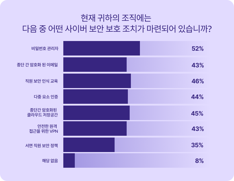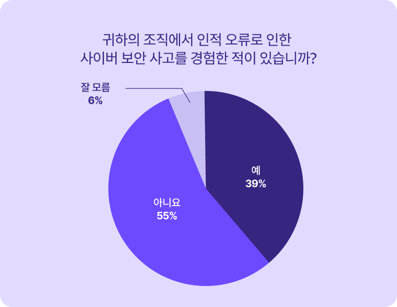 실제로 39%의 기업이 인적 오류로 인한 사이버 보안 사고를 경험했다고 보고했습니다. 강력한 보안을 위해서는 교육과 기본적으로 보안 위생을 활성화하는 안전한 비즈니스 도구가 모두 필요합니다.