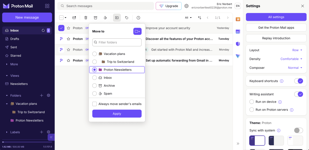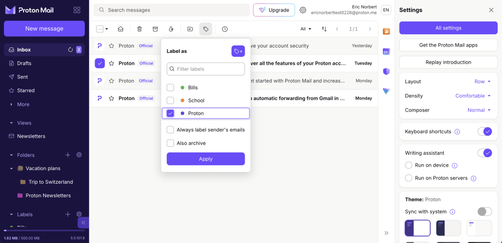 Proton Mail uses a flexible hybrid system of folders, subfolders, and labels to maximize productivity and organization within your inbox.