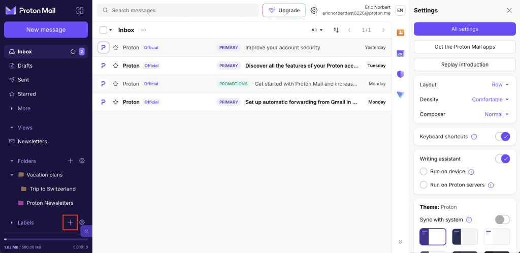 To create a new label, click the + icon next to the Labels heading in the sidebar of the main Proton Mail web app.